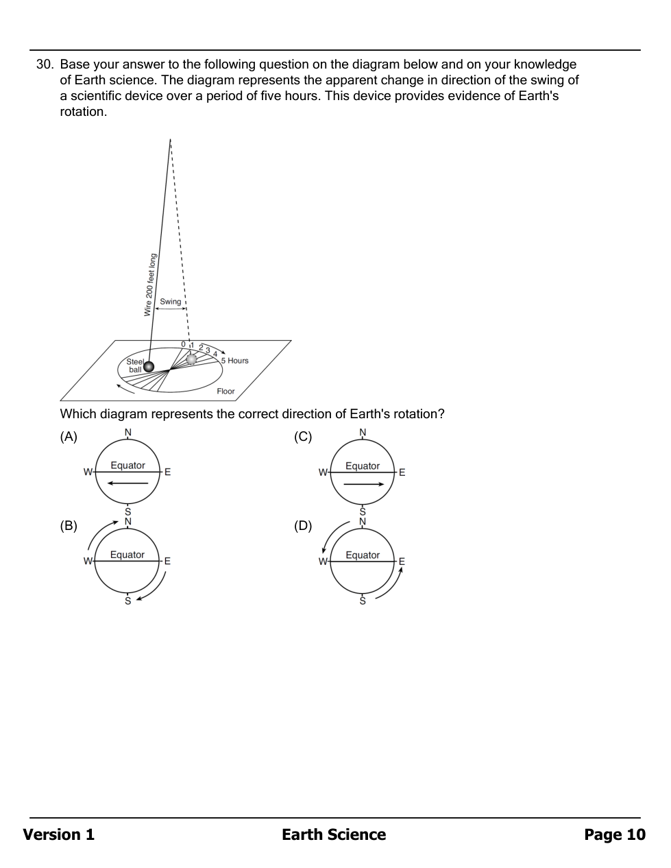Question 30: Base your answer to the following question on the diagram below and on your knowledge of Earth science. The diagram represents the apparent change in direction of the swing of a scientific device over a period of five hours. This device provides evidence of Earth's rotation.