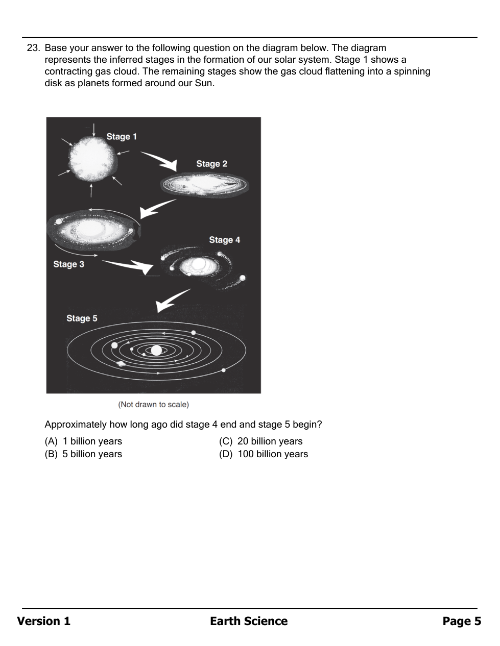 The question is: Base your answer to the following question on the diagram below. The diagram represents the inferred stages in the formation of our solar system. Stage 1 shows a contracting gas cloud. The remaining stages show the gas cloud flattening into a spinning disk as planets formed around our Sun.