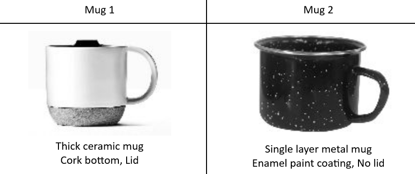 Which mug would you recommend your friend give to Vihaan? Use words from the following vocabulary list to make your explanations more scientific: