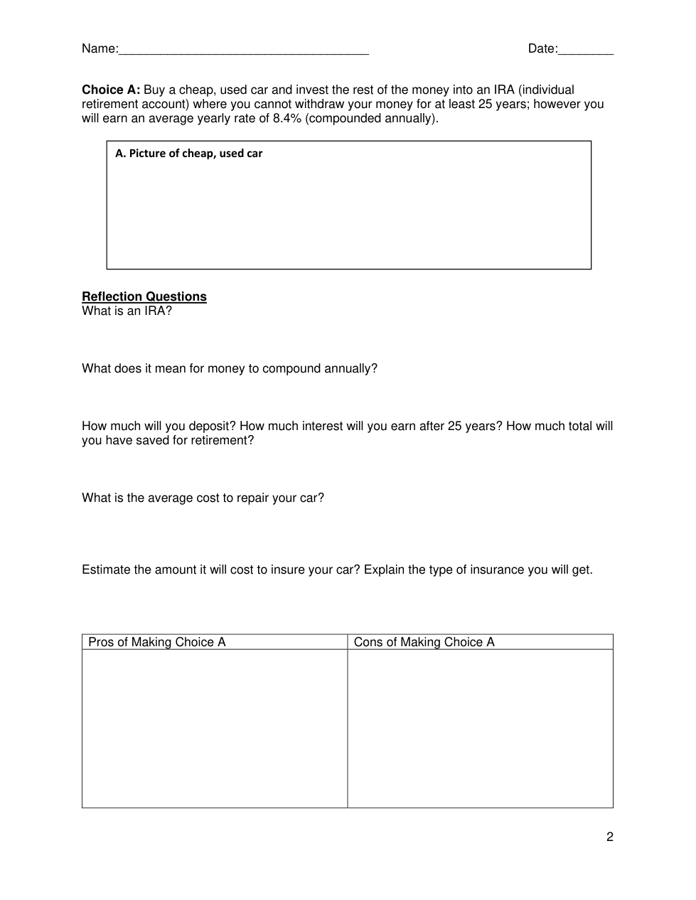 Pros of making choice A (buying a cheap car and putting the rest in an IRA)