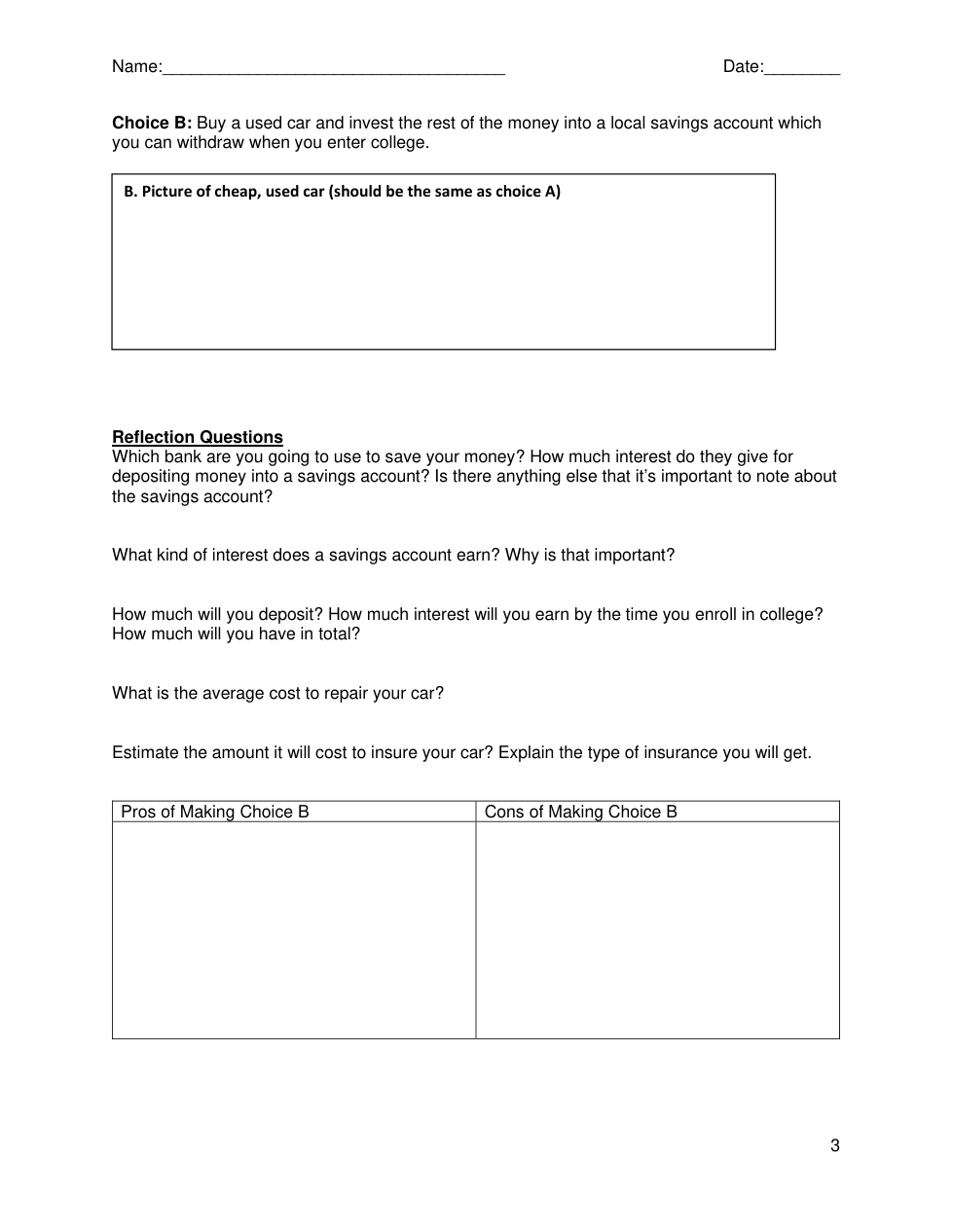 Pros of making choice B (buying a cheap car and putting the rest in a savings account)