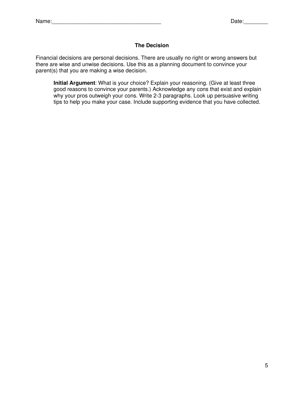 What is your choice? Explain your reasoning. (Give at least three good reasons to convince your parents.) Acknowledge any cons that exist and explain why your pros outweigh your cons. Write at least 2 paragraphs. Look up persuasive writing tips to help you make your case. Include supporting evidence that you have collected.