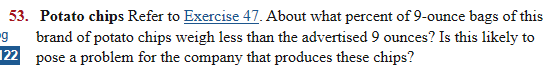 The weights of 9-ounce bags of a particular brand of potato chips can be modeled by a Normal distribution with mean 9.12 ounces and standard deviation 0.05 ounces