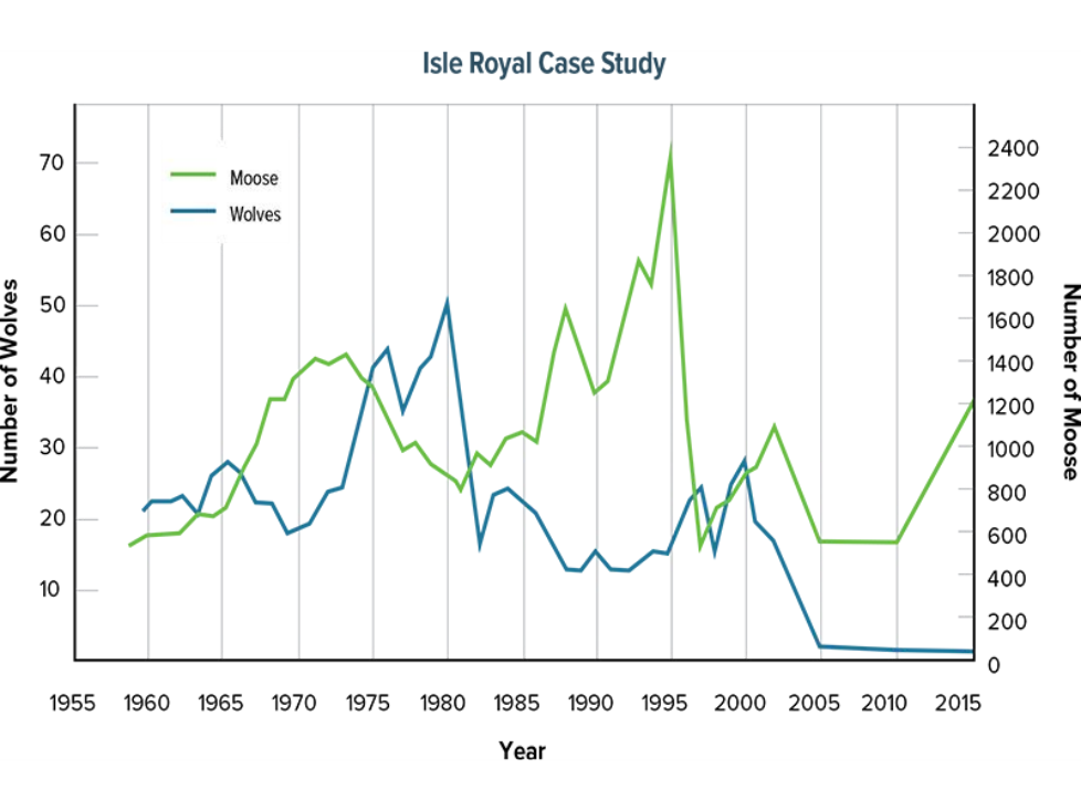 A study of density-dependent factors was done the the wolf and moose populations in northern Michigan on Isle Royale, located in Lake Superior. Prior to the winter of 1947-48, there were no wolves on Isle Royale. During that winter, a single pair of wolves crossed the ice on Lake Superior, reaching the island. During the next 10 years, the population of wolves reached about 20 individuals. Check out the graph that shows the results of a long-term study done by population biologists. The green line represents the moose population. The blue line represents the wolf population.