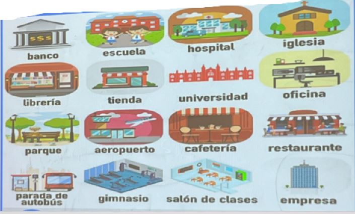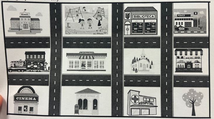 La biblioteca esta _______________________ el parque y la estacion de policias.