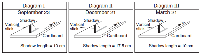 On the diagram provided, draw the direction and length of the shadow at noon that will most likely be observed at 42° N latitude on June 21.