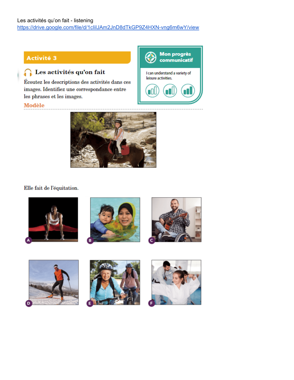 Match the picture to what is being said (first one about l'équitation is the example/model)