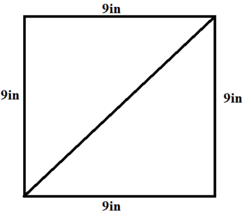 A linen napkin, in the shape of a square, has sides that 9 inches long. If the napkin is folded along the diagonal, what is the length of the diagonal? (Leave your answer in radical form)