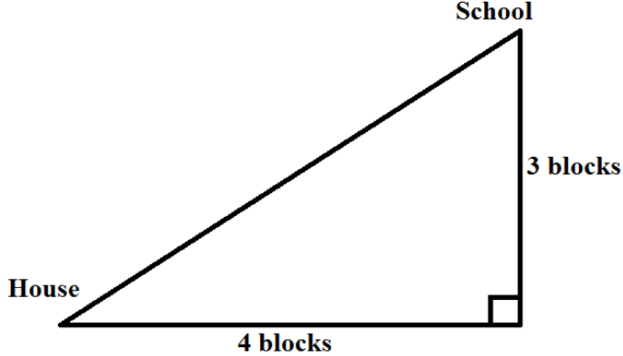John walks 4 blocks east and 3 blocks north to get to his school, as shown below. How many fewer blocks would John have to walk from his house to school if he were able to walk diagonally between the two locations?