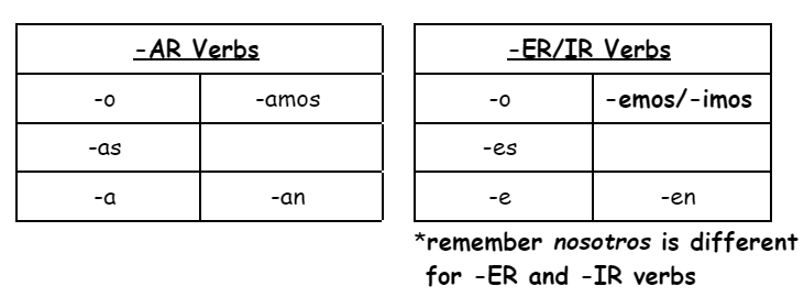 Instructions: Look at the charts below and review the endings for -AR, -ER, and -IR verbs. Then conjugate the verbs in parenthesis to complete each sentence.