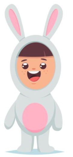 Each rabbit costume needs 1 1/2 yards of white fur fabric, 1 yard of blue striped fabric, and 1/4 yard of pink felt for the ears.