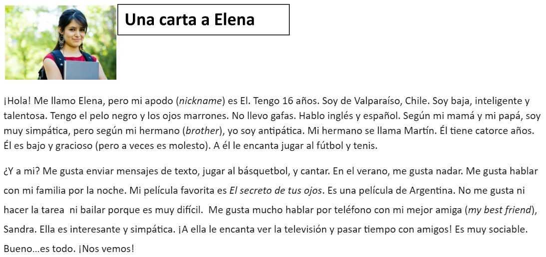 - As you know, our class is about the ability to communicate about your identidad in Spanish. You now know how to say so much about yourself and others. In Part 1 of this response, write which activities you like, love, dislike, or hate. Additionally, state when, with whom, where and why you like to do these activities. For this section, I am looking for complexity and creativity in your answers. In Part 1 be sure to include: