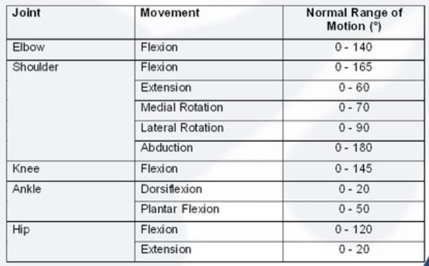 The table below represents the normal ranges of motion for various joints in the body. If a patient suffers a severe injury to their ankle, describe how you would expect their range of motion for dorsiflexion and plantar flexion would change.