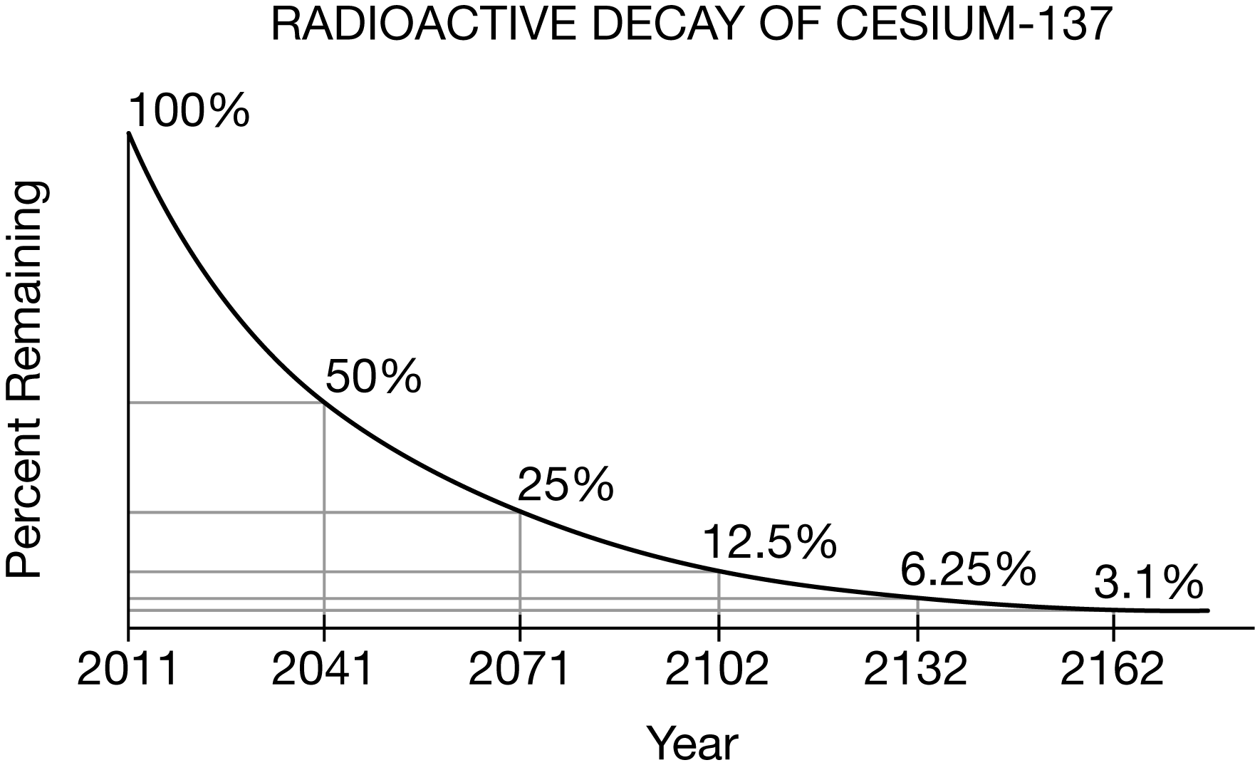 The graph above shows the radioactive decay of Cesium-137 that was produced in a power plant in 2011.