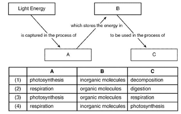 Vernon is using the diagram shown below to develop a model of photosynthesis. The letters A, B, and C each represent a reactant or product of the process.