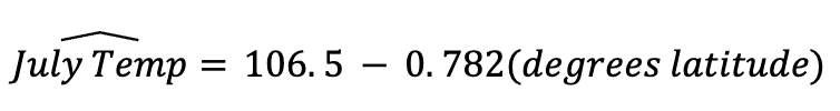 The scatterplot shows the relationship between latitude and mean July temperature (in degrees Fahrenheit) for 12 cities in the United States.