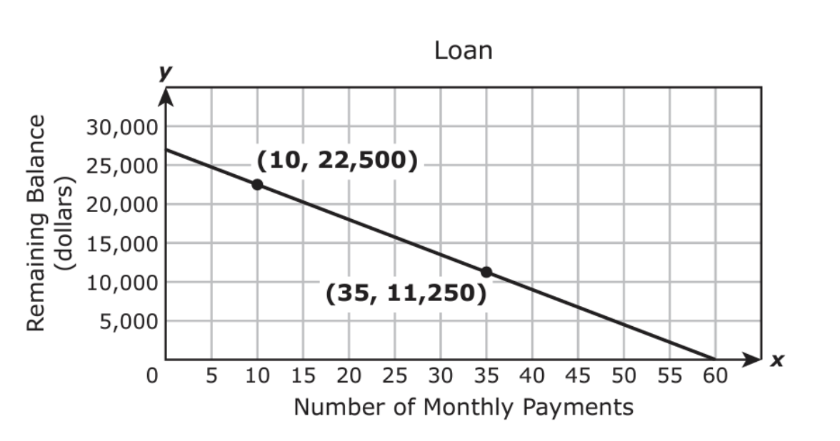 The graph models the linear relationship between the number of monthly payments made on a loan and the remaining balance in dollars left to pay on the loan.