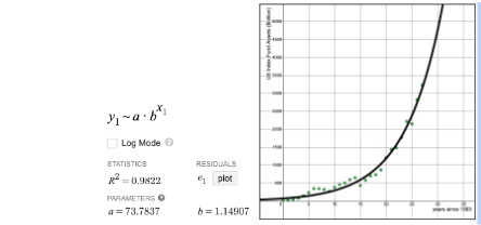 The data points below represent the total assets invested in index funds in the US each year since 1993. Analyze the results of the exponential regression model shown. Which of the following statements is true?
