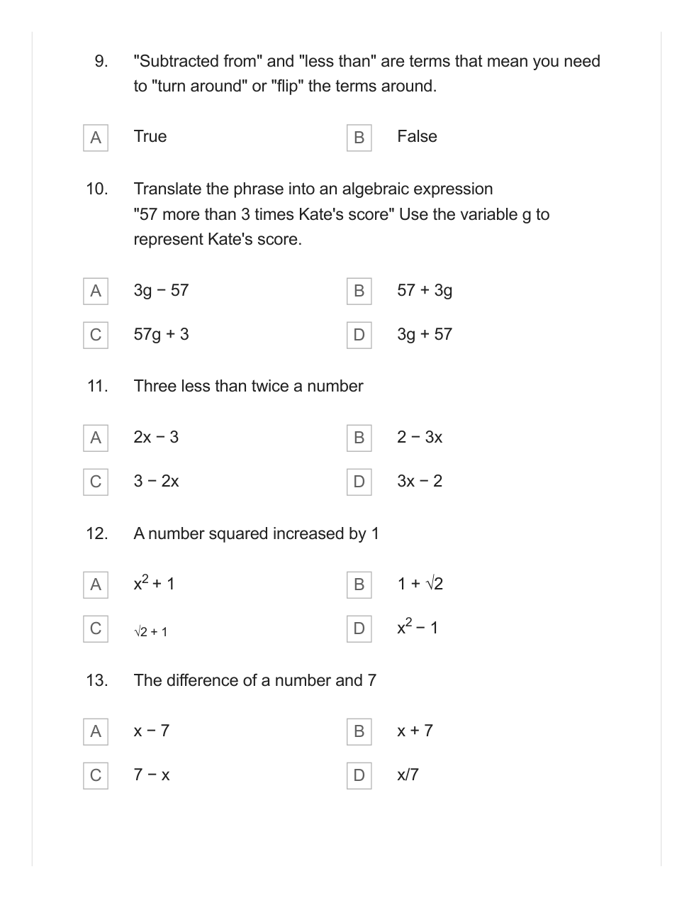Translate the phrase into an algebraic expression "57 more than 3 times Kate's score" Use the variable g to represent Kate's score.