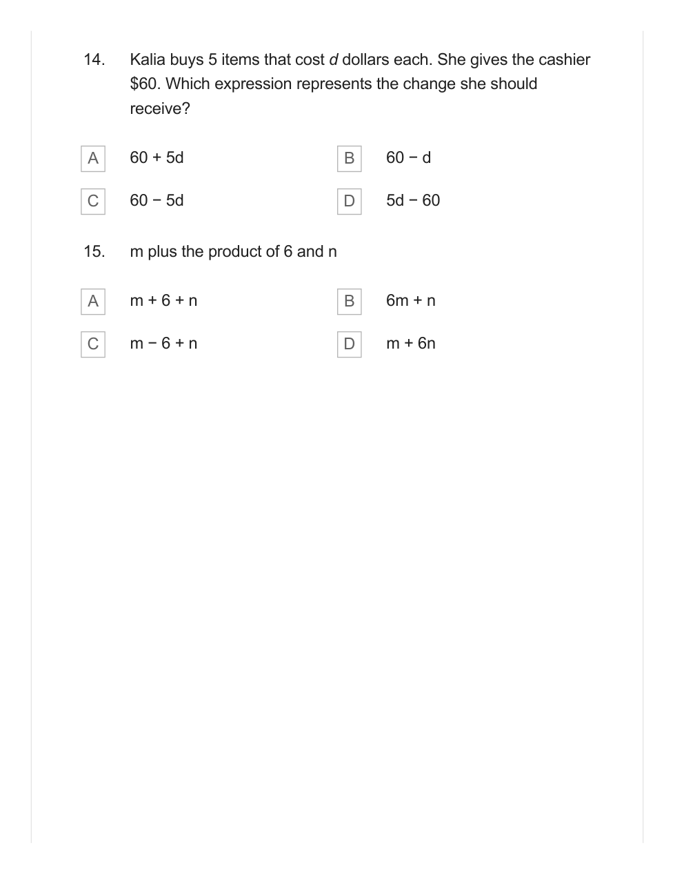 Kalia buys 5 items that cost d dollars each. She gives the cashier $60. Which expression represents the change she should receive?