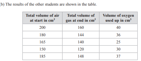 Total volume of air at start in cm3: 140 Volume of gas at end in cm3: 111