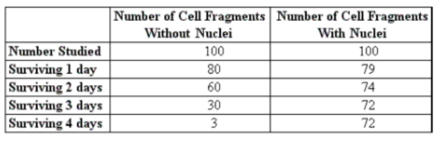This item refers to an investigation in which cells were cut in half. They were cut in a way that one half of each cell contained a nucleus and one half had no nucleus. One hundred fragments from each group were placed in containers with the same conditions. The table below shows the results.