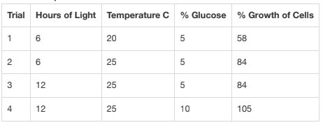 Scientists have the ability to grow human cells in a lab. They take sample cells from a donor and allow them to grow and reproduce in a petri dish on a nutrient rich gel. A scientist wanted to determine the effect of light, temperature, and available glucose on cell growth. He did an initial test and then changed only 1 thing each trial. Each time the cells were allowed to grow for 48 hours. The data is in the table below. Use this data to answer the questions that follow.