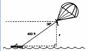 The figure shows a person parasailing. What is x, the height of the parasailer, to the nearest foot?