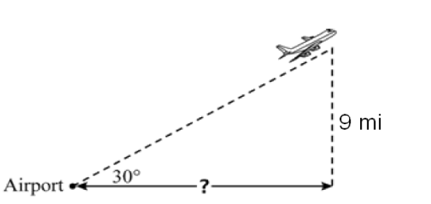 An aircraft takes off and climbs at a constant 30 degree angle, until it reaches an altitude of 9 miles. What is the planes horizontal distance from the airport?