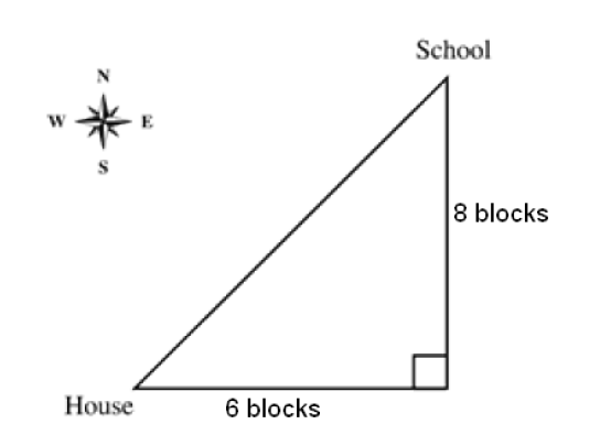 John walks 6 blocks east and then 8 blocks north to his school. Find the angle where the house is.