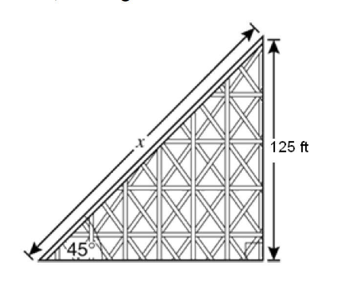 Rob wants to design the first section of a roller coaster track. He wants the ramp section to rise at 45 degrees. If it is 125 feet tall, find X, the length of the track.