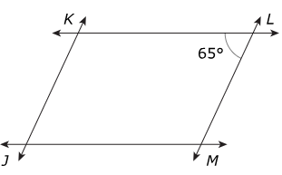 Line JM is parallel to line KL. The measure of angle KLM is 65°. Kevin states that he can determine the measures of all four interior angles from only the information given.