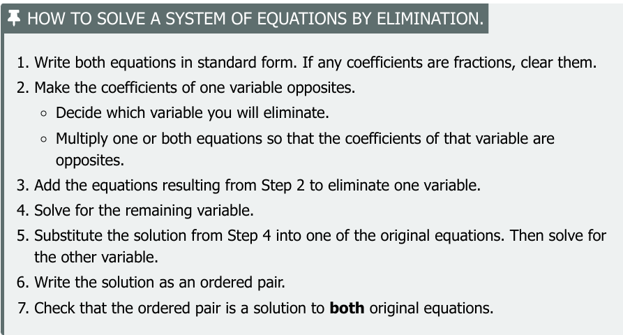 To solve a system of equations by elimination, we start with both equations in standard form. Then we decide which variable will be easiest to eliminate. How do we decide? We want to have the coefficients of one variable be opposites, so that we can add the equations together and eliminate that variable.