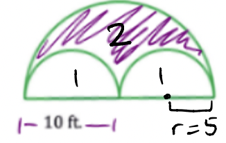 Watering Problem—Kenneth put two sprinkler heads at the center of the two small semicircles. The radius of the sprinklers is 5 ft. If the area in the largest semicirclular area is the shape of the entire lawn, how much of the lawn will not be watered? (In other words, find the area in purple)