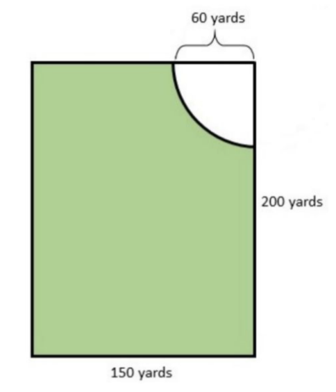 Noah has a rectangular plot of land. The shaded part of the diagram represents the grass area of his land. The unshaded part, which is a quarter circle, does not have grass.