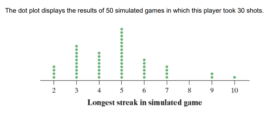 When the basketball player attempts a shot. It is either made or missed and he is a 50% shooter. Describe how you would carry out a simulation to estimate the probability that a 50% shooter who takes 30 shots in a game would have a streak of 10 or more made shots.