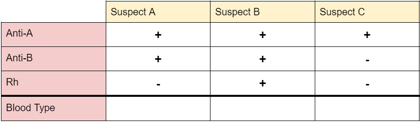 3 suspects were taken in for questioning and each provided a sample of blood. The results are shown in the table below:
