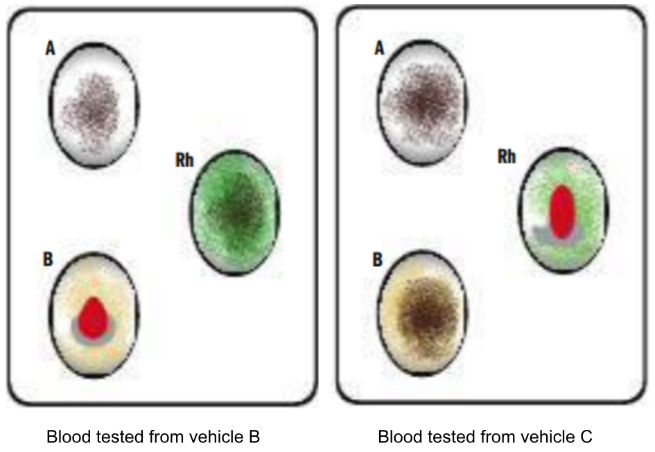 Using the following blood-typing results, indicate the apparent blood type recovered from Vehicles B and C. Determine whether the blood from the car of each suspect is consistent with the victim’s blood type of AB negative.