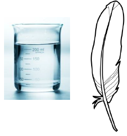 The mass of the liquid in the beaker is 100 times more than that of the solid feather. If the mass of the water is 5 kilograms (kg), what is the mass of the feather?