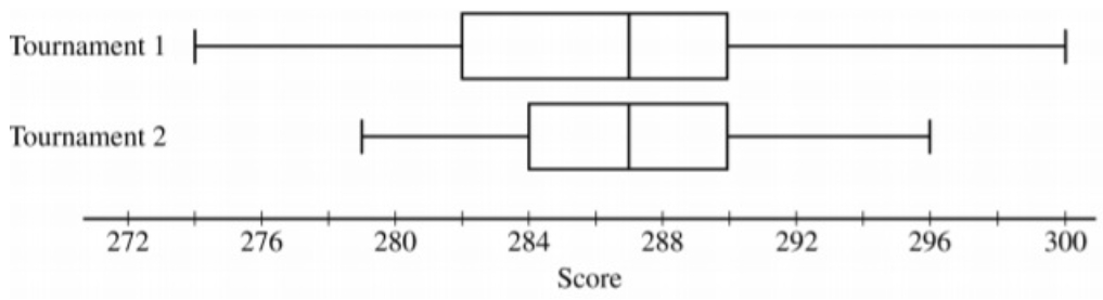 In a standard golf tournament, golfers play 18 holes of golf on each of 4 consecutive days. For each hole, golfers keep track of the number of times they hit the ball (strokes) before the ball goes into the cup. A golfer’s score for the tournament is the total number of strokes needed to complete the tournament. The boxplots below summarize the scores for golfers who competed in tournament 1 and golfers who competed in tournament 2.