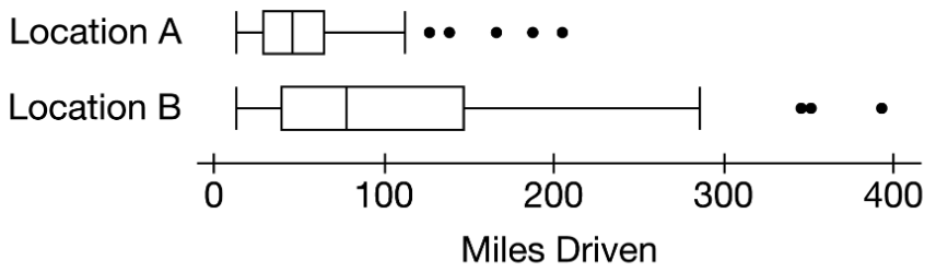 A car rental agency has two locations in a city. The boxplots below summarize the miles driven for one day of single-day car rentals at each location.