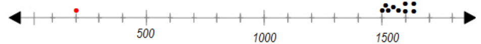 The following dotplot shows the scores of 25 people who played an online trivia game.