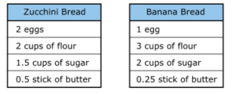 Hayley bakes zucchini bread and banana bread. Some of the ingredients Hayley uses for each type of bread are shown in the tables.