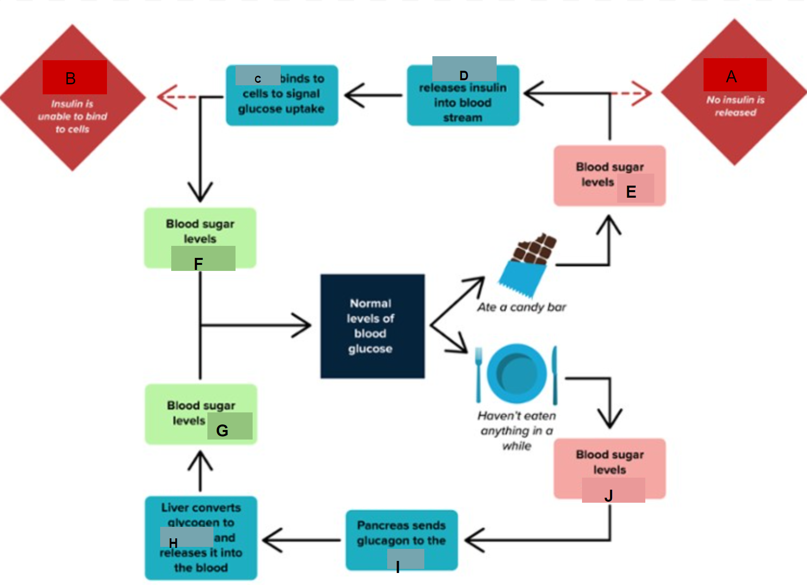 H | arrow_right_alt | secretes insulin and glucagon to regulate blood sugar |