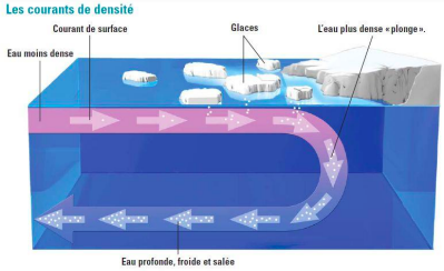 Dans les régions polaires, l'eau est très froide et _______ , donc très dense. Cette eau _______ de l'océan. Cette eau se déplace lentement vers l'équateur au fond de l'océan.