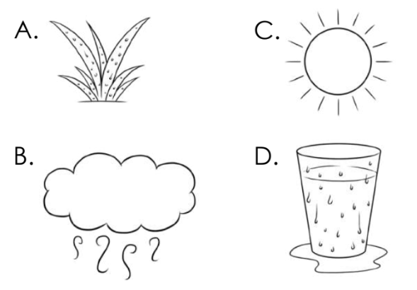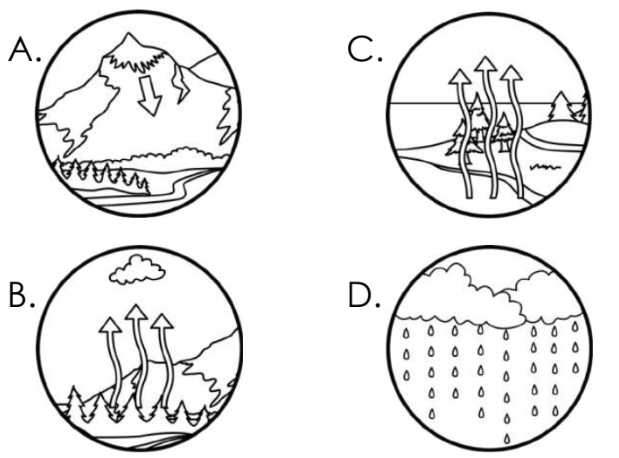 A potential sequence of three stages in the water cycle is shown below.