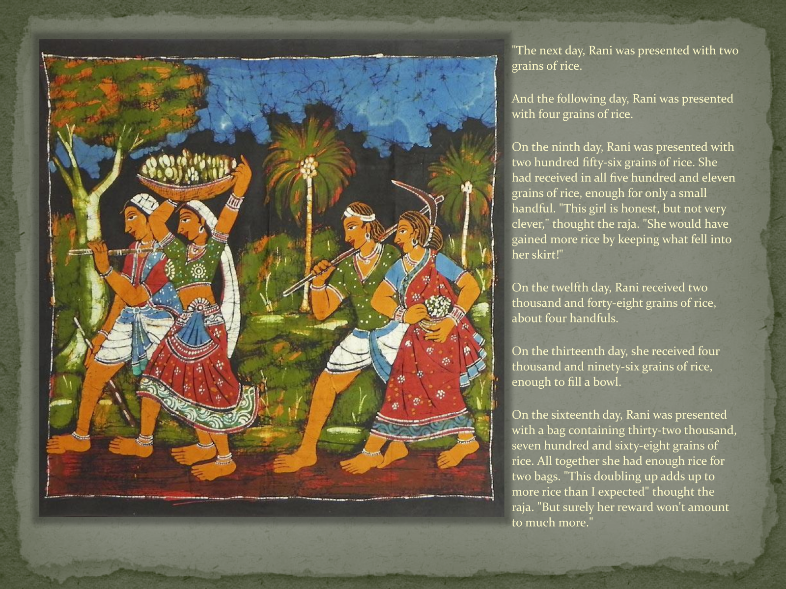 Write a sentence that describes the total number of grains of rice Rani will receive through a certain number of days.
