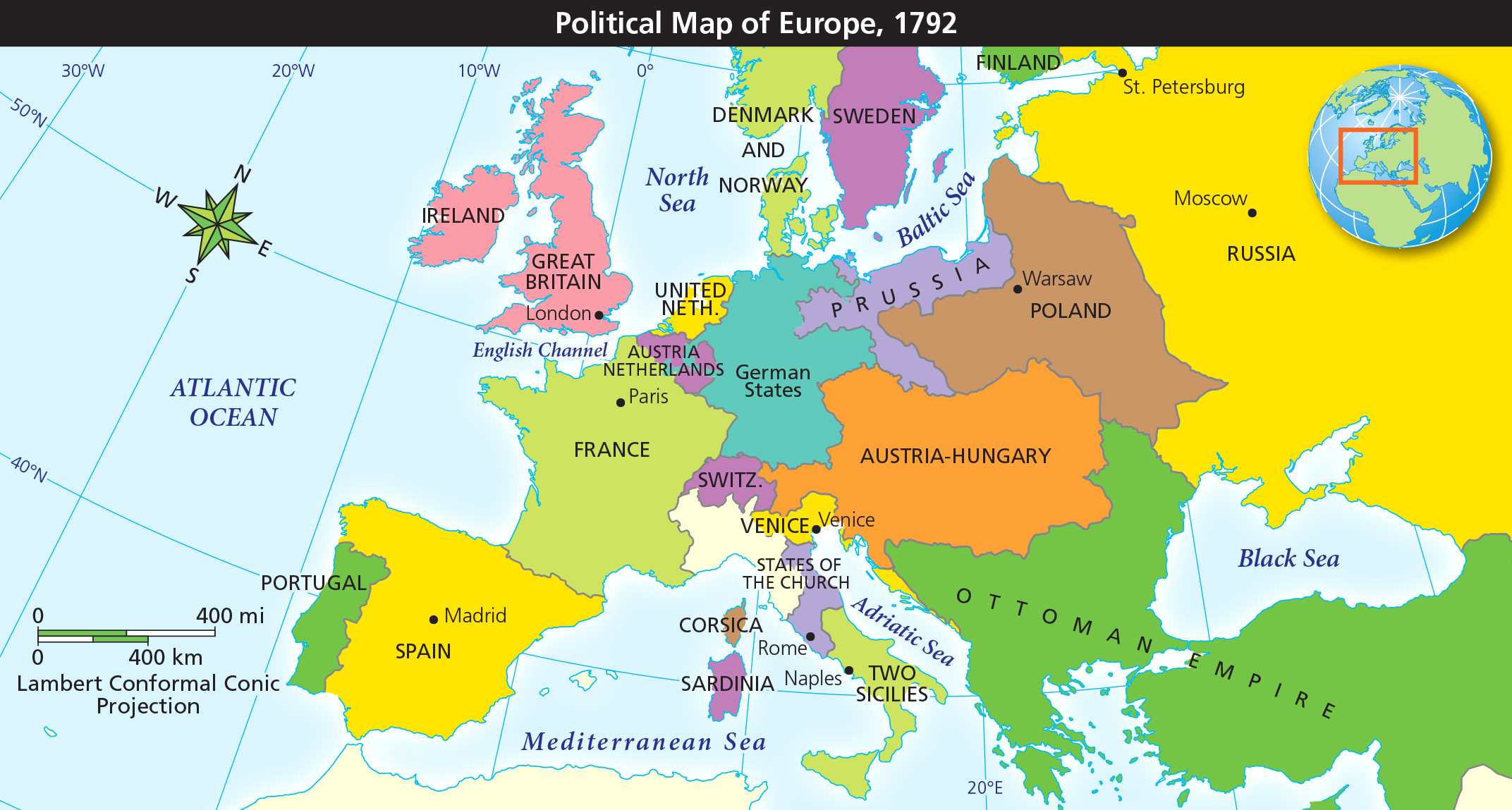 Based on the map, why would the rulers of European countries be fearful of events in France during the French Revolution?