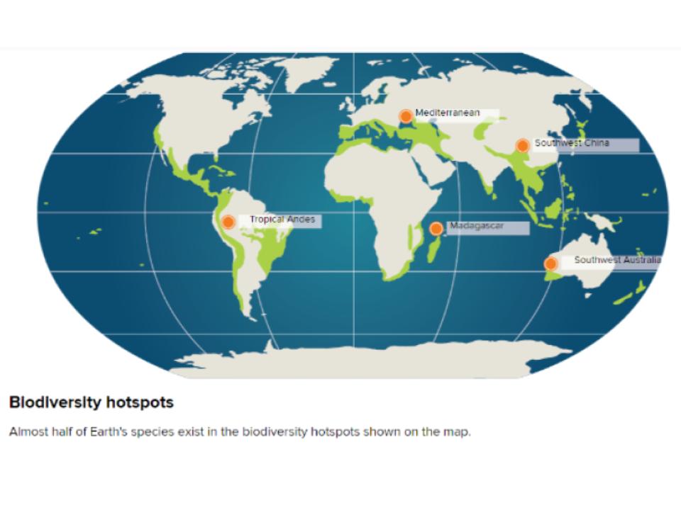 Approximately half of all plant and animal species are found in hotspots. There hotspots originally covered 17% of Earth's surface, however currently only about 1/10th of those habitats remain.