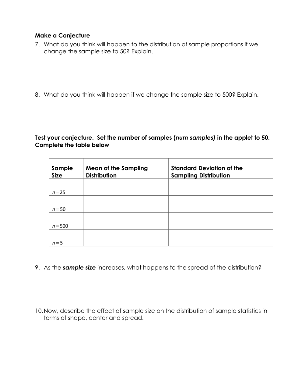 What do you think will happen to the distribution of sample proportions if we change the sample size to 50? Explain.